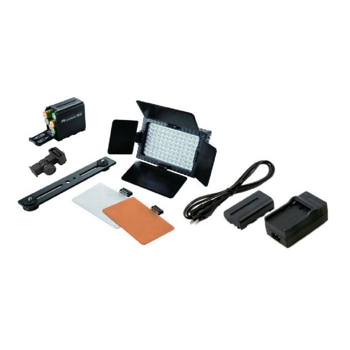 Wordt geleverd inclusief: lamp, tilting bracket, NP-F550 accu, lader, montagebeugel, kleppenset, kleurfilter diffuus, kleurfilter oranje en een extra batterijbehuizing geschikt voor 6 penlites. Zo ben je in één keer klaar voor elke fotoshoot of videosessie.