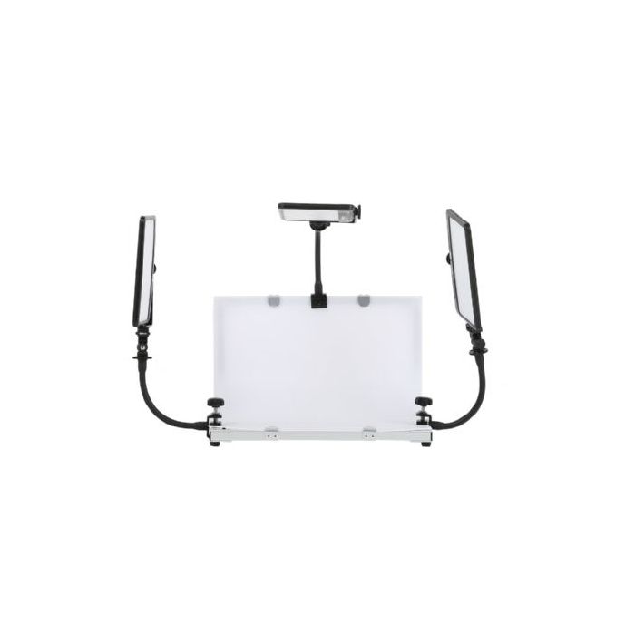 De set bevat drie DV-80SL LED lampen met een stijlvol en compact design. Met een dikte van slechts 12 mm passen deze lampen perfect in elke opstelling. Je hebt de flexibiliteit om de kleurtemperatuur van 3200K tot 5600K aan te passen. Met een CRI waarde van 95 leg je elk detail natuurgetrouw vast. Verlicht het product en de achtergrond gelijkmatig dankzij de 90 graden hoek en richt de lampen nauwkeurig met de meegeleverde flexibele stangen.