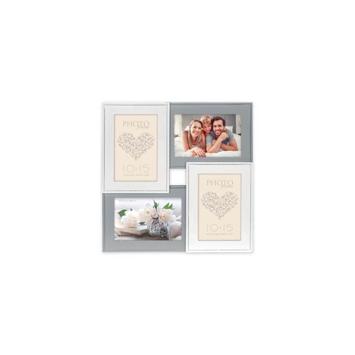 De Zep Fotolijst HH154 Rouen 4Q 4x 10x15 cm biedt een elegante manier om herinneringen te tonen. Met plek voor 4 foto's van 10x15 cm, voegt deze lijst een stijlvolle touch toe aan elke omgeving. Het verfijnde ontwerp in wit en grijs hout, samen met de overlappende lagen, creëert een dynamische wandpresentatie. Perfect voor zowel thuis als het kantoor, de totale afmeting inclusief lijst is 31,5x31,5 cm.