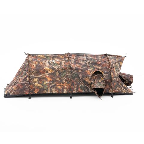 De Falco Mark IV valt volledig op in zijn omgeving — of beter gezegd: niet. De tent wordt geleverd in drie camouflageprints: groen, bruin of riet. Met de aangebrachte touwtjes voeg je eenvoudig natuurlijke materialen toe zoals takken of bladeren. Voor extra camouflage gebruik je een apart camouflagenet. Hiermee laat je je tent nog beter opgaan in het landschap.